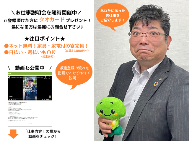 派 動画あり 掲載終了まであと6日 北海道ハピネス株式会社 ①乳製品の検品・包装作業(音更町) お仕事とお住まいを一緒にご紹介します!送迎応相談! 時給 1,250円~ 勤務地は河東郡音更町 動画 保存 求人詳細 派 動画あり 掲載終了まであと6日 北海道ハピネス株式会社 ②カップスープ製造(芽室町) 急募!お仕事とお住まいを一緒にご紹介します! 時給 1,200円~ 勤務地は河西郡芽室町の工場です 動画 保存 求人詳細 派 動画あり 掲載終了まであと6日 北海道ハピネス株式会社 ③倉庫内でのリフト作業(帯広市) お仕事とお住まいを一緒にご紹介します! 時給 1,290円 勤務地は帯広市です 動画 保存 求人詳細 派 動画あり 掲載終了まであと6日 北海道ハピネス株式会社 ④遊戯施設内の清掃業務(帯広市) お仕事とお住まいを一緒にご紹介します!送迎応相談! 時給 1,200円~ 勤務地は帯広市 動画 保存 求人詳細 派 動画あり 掲載終了まであと6日 北海道ハピネス株式会社 ⑤段ボール製造・検品(士幌町) 急募!お仕事とお住まいを一緒にご紹介します! 時給 1,100円 勤務地は河東郡士幌町です 動画 保存 求人詳細 派 動画あり 掲載終了まであと6日 北海道ハピネス株式会社 ⑥チーズ製造(音更町) お仕事とお住まいを一緒にご紹介します!送迎あり! 時給 1,080円~ 勤務地は河東郡音更町 動画 保存 求人詳細 派 動画あり 掲載終了まであと6日 北海道ハピネス株式会社 ⑦豆腐・納豆製造(音更) お仕事はルーチンワークです!お子様を保育園に送ってから出社されたい方もご相談下さい! 時給 1,120円 勤務地は音更町です 動画 保存 求人詳細 派 動画あり 掲載終了まであと6日 北海道ハピネス株式会社 ⑧リーチリフトオペレーター(帯広) 急募!お仕事とお住まいを一緒にご紹介します! 時給 1,200円 勤務地は帯広市内です 動画 保存 求人詳細 派 動画あり 掲載終了まであと6日 北海道ハピネス株式会社 ⑨施設共用部清掃(帯広市) ★お仕事とお住まいを一緒にご紹介します! 時給 1,200円 勤務先は帯広市内です 動画 保存 求人詳細 派 動画あり 掲載終了まであと6日 北海道ハピネス株式会社 ➉パン粉製造スタッフ(士幌町) ★お仕事とお住まいを一緒にご紹介します! 時給 1,150円 勤務先は士幌町の食品工場です 動画 保存 求人詳細