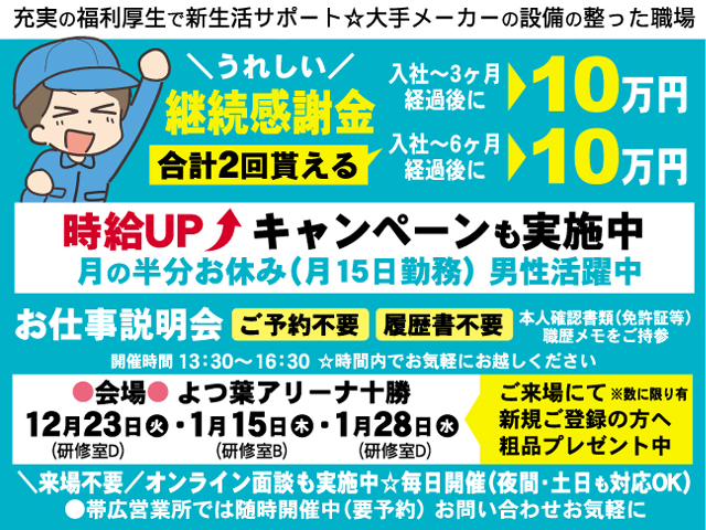 派 動画あり 掲載終了まであと20日 北海道ハピネス株式会社 ⑪スーパー内業務(帯広・芽室) お仕事+住居を一緒にご紹介します! 時給 1,080円~ 勤務地は帯広または芽室です 動画 保存 求人詳細 派 動画あり 掲載終了まであと20日 北海道ハピネス株式会社 ⑫客室清掃(帯広市) ★お仕事とお住まいを一緒にご紹介します! 時給 1,200円 勤務先は帯広市内です 動画 保存 求人詳細 派 動画あり 掲載終了まであと20日 北海道ハピネス株式会社 ⑬電子部品運搬/出荷準備(帯広市) お仕事とお住まいを一緒にご紹介します! 時給 1,220円 勤務地は帯広市です 動画 保存 求人詳細 契 動画あり 掲載終了まであと20日 北海道ハピネス株式会社 ⑮美容学校教員 (帯広) 2025年4月に開校したばかりの学校です! 月給 200,000円~ 勤務地は帯広市の理容・美容学校です 動画 保存 求人詳細 派 掲載終了まであと20日 パーソル ファクトリーパートナーズ株式会社 ②製造オペレーター ★交通費支給★かんたん軽作業★ 時給 1,300円~2,000円 北海道帯広市西19条北 保存 求人詳細 派 動画あり 掲載終了まであと20日 パーソル ファクトリーパートナーズ株式会社 ①小型部品の顕微鏡検査 帯広のパナソニック工場で働こう ★交通費全額支給 ★ 時給 1,200円 北海道帯広市西25条北1-2-1 動画 保存 求人詳細 派 動画あり 掲載終了まであと20日 北海道ハピネス株式会社 ⑭冷蔵倉庫内での梱包・発送(音更) お仕事とお住まいを一緒にご紹介します! 時給 1,080円 勤務地は音更町です 動画 保存 求人詳細