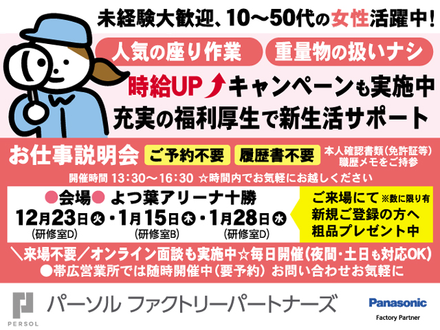 派 動画あり 掲載終了まであと20日 パーソル ファクトリーパートナーズ株式会社 ①小型部品の顕微鏡検査 帯広のパナソニック工場で働こう ★交通費全額支給 ★ 時給 1,200円 北海道帯広市西25条北1-2-1 動画 保存 求人詳細