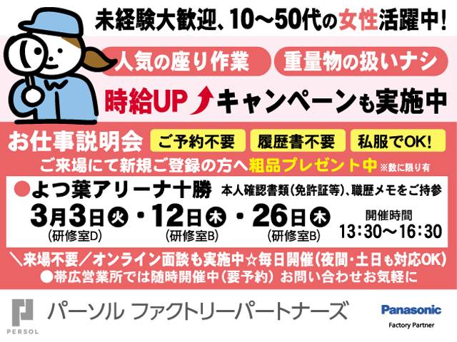 派 動画あり 掲載終了まであと1日 パーソル ファクトリーパートナーズ株式会社 ①小型部品の顕微鏡検査 人気の座り業務 ★交通費全額支給 ★ 時給 1,200円 北海道帯広市西19条北 動画 保存 求人詳細