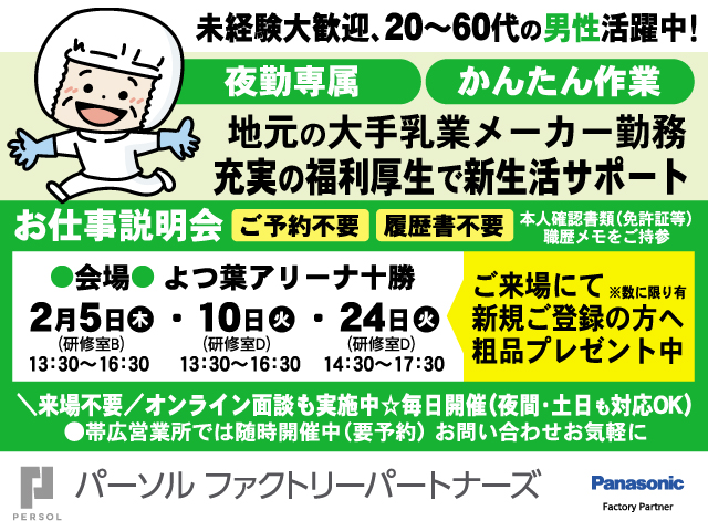 派 動画あり 掲載終了まであと6日 パーソル ファクトリーパートナーズ株式会社 ①生乳の受入・洗浄 ☆シニア大歓迎☆★20~50代男性がご活躍中★ 時給 1,300円~1,625円 北海道河東郡音更町 動画 保存 求人詳細