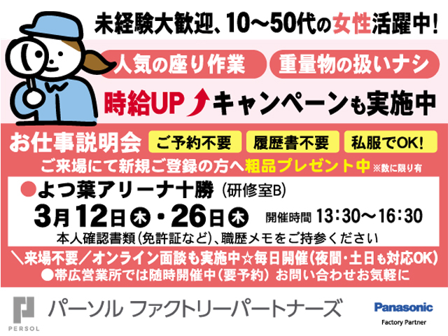 派 動画あり 掲載終了まであと5日 パーソル ファクトリーパートナーズ株式会社 ①小型部品の顕微鏡検査 人気の座り業務 ★交通費全額支給 ★ 時給 1,200円 北海道帯広市西19条北 動画 保存 求人詳細